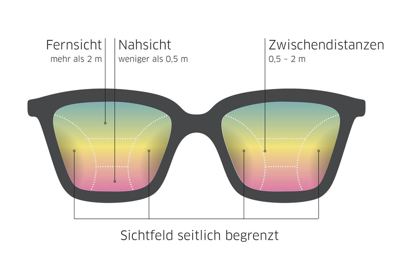 Gleitsichtgläser sind Brillengläser mit speziell eingearbeiteten Sehbereichen, die ein nahezu stufenloses Sehen vom Nahbereich bis in die Ferne zulassen.